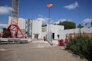 Au mois de juillet, les murs préfabriqués ont été mis en place autour de la zone qui sera consacrée au stockage de bois et autour des locaux sociaux puis, en août, autour des chaufferies gaz et de la chaufferie bois. Ces élévations ont pris fin en septembre pour laisser leur place à la pose des équipements de transport du bois tels qu’un convoyeur et une échelle à barreaux.