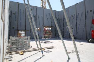 Au mois de juillet, les murs préfabriqués ont été mis en place autour de la zone qui sera consacrée au stockage de bois et autour des locaux sociaux puis, en août, autour des chaufferies gaz et de la chaufferie bois. Ces élévations ont pris fin en septembre pour laisser leur place à la pose des équipements de transport du bois tels qu’un convoyeur et une échelle à barreaux.
